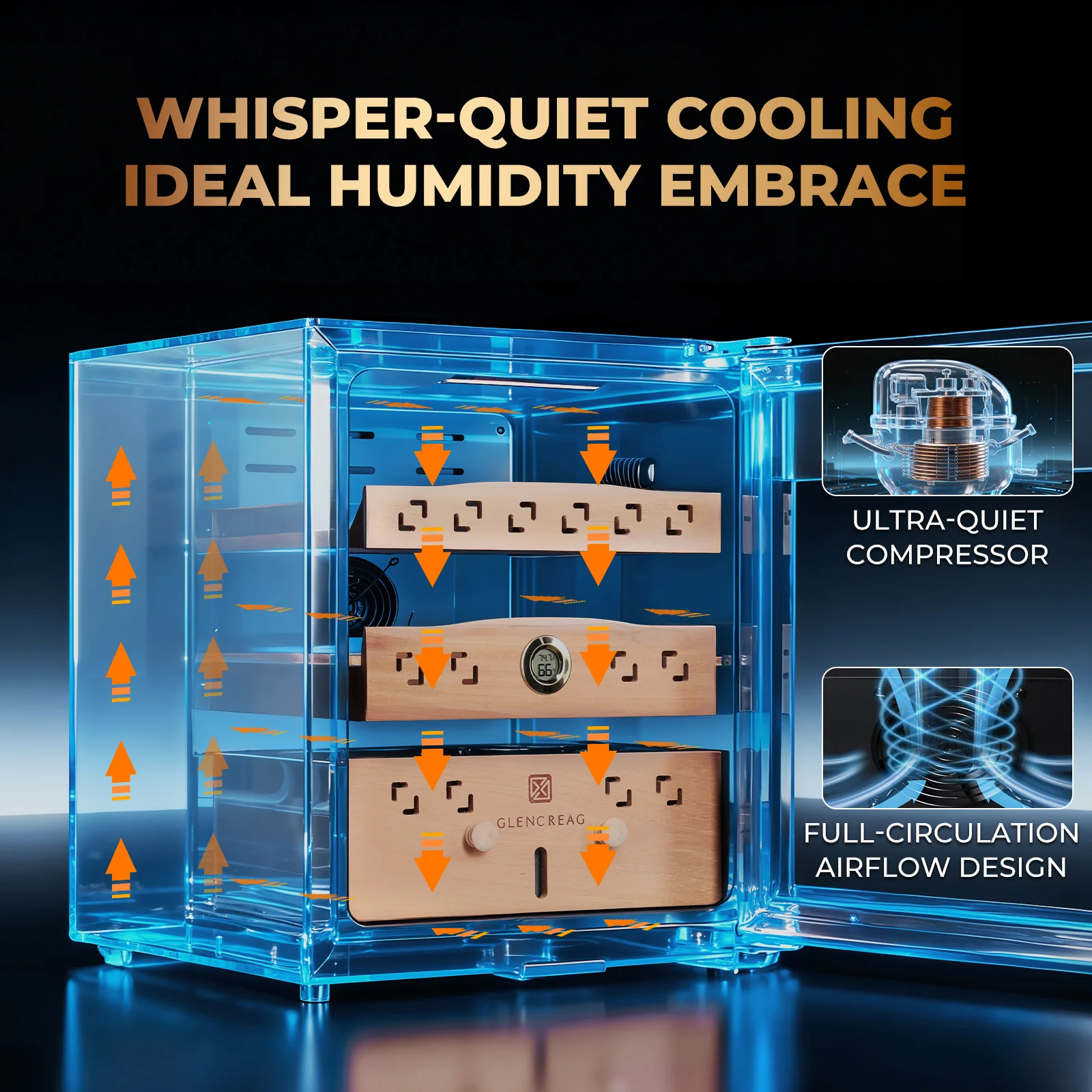 ăPatented HâO·⻠Ammonia Removal TechăExclusive âAmmonia Clearâ system generates HâO·⻠that actively capture and neutralize NHâ released during cigar aging, preserving aroma, refining flavor, and keeping the cabinet fresh.