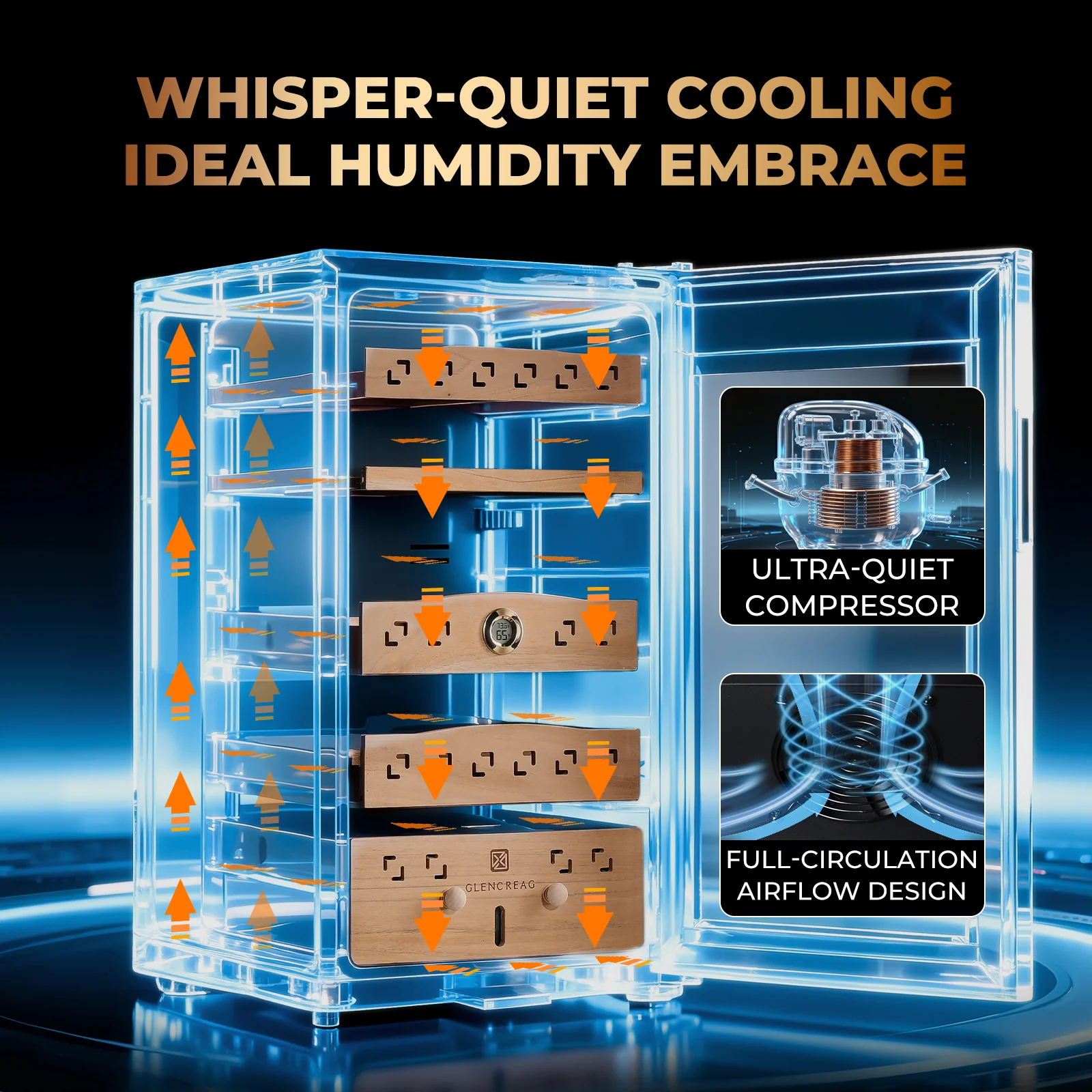 ăPremium Craftsmanship & SecurityăSpanish cedar drawers enrich cigar aging while resisting pests and mold. Features include soft interior lighting, a mechanical lock for protection, and a sleek modern design for upscale presentation.